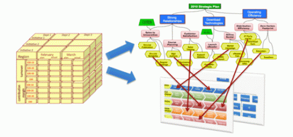 The terminology involved depends on the management methodology being employed (e.g. Balanced Scorecard), but most methodologies will show the relationship between the action and the objective being supported as a ‘Strategy Map’.