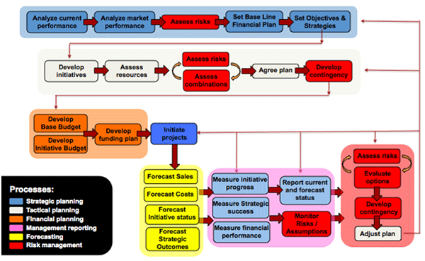 These are typically seen and often implemented as the six distinct processes of Strategic Planning, Tactical Planning, Financial Planning, Forecasting, Management Reporting, and Risk Management.