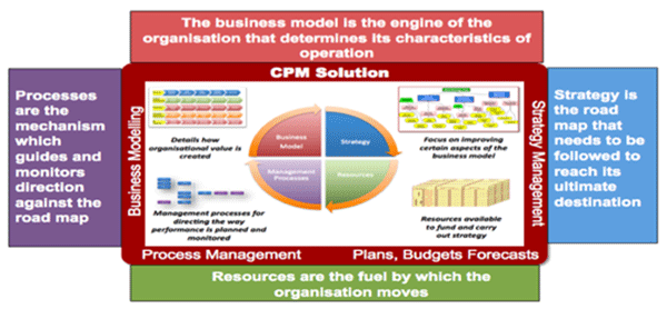 At the heart of a CPM system is an organisation model containing the relationship of activities that lead to organisational objectives.