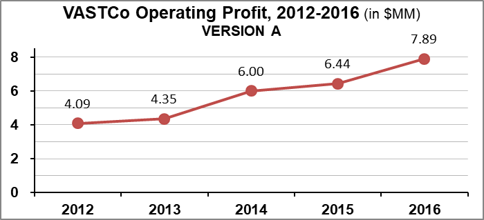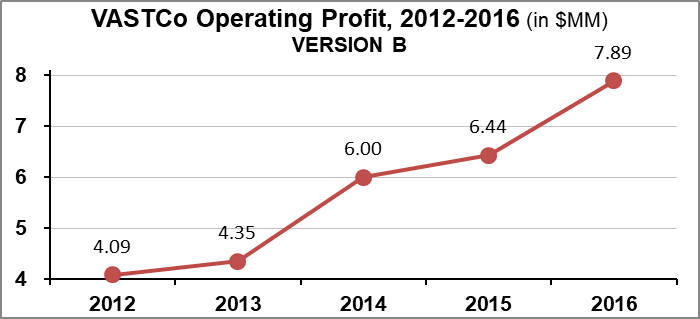 VASTCo has done well, nearly doubling its profit over four years. Now, here’s Version B of the same graph, with some “slight” changes to the vertical axis scale: