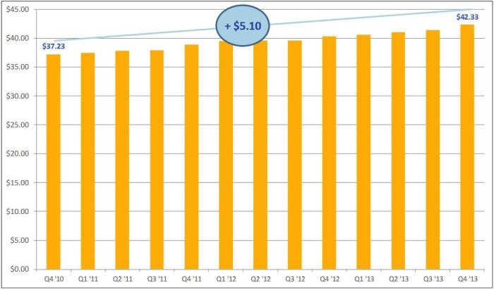 Just as we discussed above, note that the vertical axis scale starts at $34.00 – so visually, the 15% increase over the thirteen quarters looks pretty impressive. Now here’s my version of the same graph, with the scale starting at zero: