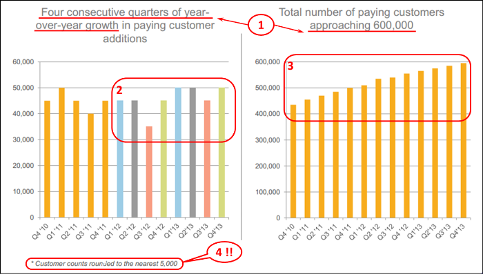 - “Four consecutive quarters of year-over-year growth” sounds impressive at first, but think about it… aren’t they merely saying, “One consecutive year of year-over year growth”? And customers “approaching 600,000” certainly uses a number with a lot of zeroes, but is it impressive? Compared to what? This seems to be a highly selective presentation of data, sometimes known as cherry-picking, and can be fatal to any FP&A professional’s reputation for candor and integrity.