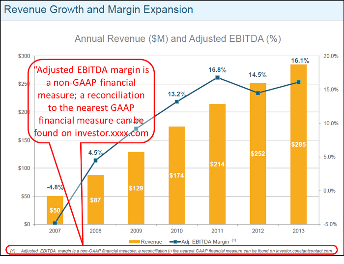 Why are these two metrics presented on the same graph? Are they trying to show some sort of correlation? Moreover, EBITDA % is flat or down over the final three years, while revenues continued to grow. I was also struck by the footnote in tiny print at the bottom, which I have expanded, in the red type balloon, for the optically challenged. This company is clearly shying away from GAAP (i.e., “generally accepted accounting principles”) numbers – in fact, the entire 26-slide presentation has almost no GAAP numbers other than reported revenue. I’ll grant that financial statements strictly in conformance with GAAP – or with IFRS, for that matter – frequently fall short of perfect clarity, but too much reliance on pro forma financials can create the same kind of suspicion I’ve been talking about.