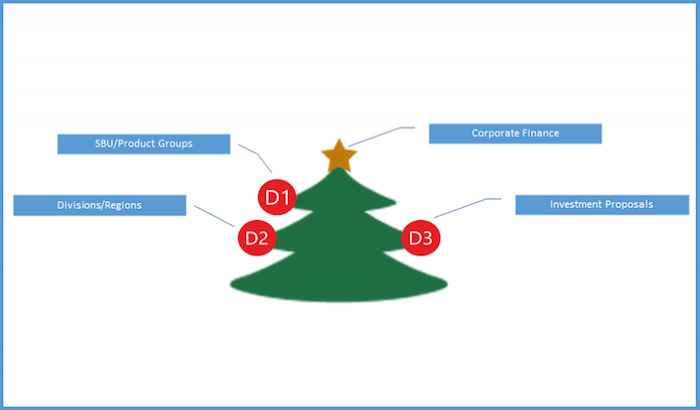 I like to illustrate this point using a Christmas tree, where the star at the top is typically Corporate Finance and the bulbs below represent secondary cascading management units. It would be chaotic to have 40-50 people all running scenario analysis concurrently. Instead, it’s more often a case of 5-10 peers debating targets before it is cascaded to the next small team.