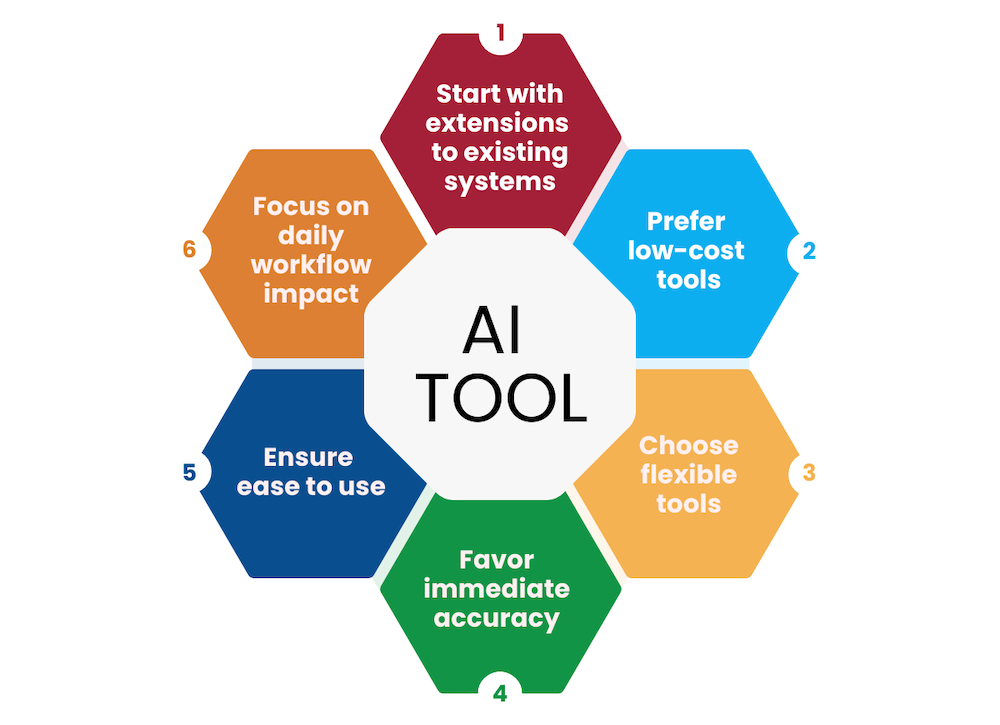 To make the first step easier, the following framework summarises how FP&A teams can evaluate and choose small AI tools that truly fit their day-to-day needs. Figure 2 presents a practical framework that helps FP&A leaders evaluate small AI tools by focusing on extensions to existing systems, low-cost options, accuracy, flexibility, ease of use, and immediate workflow impact.