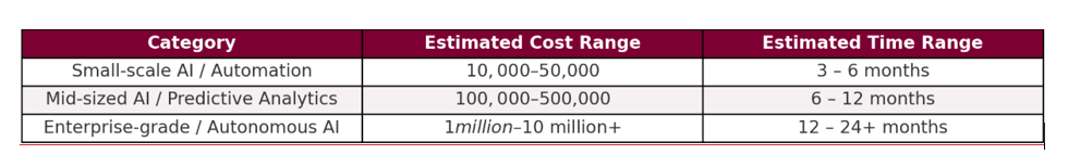 The challenge becomes even clearer when we look at how much time and investment full-scale AI programs require across different types of companies. Figure 1 below summarises the typical cost ranges and implementation timelines for small-scale, mid-sized, and enterprise-grade AI solutions, highlighting why adoption remains challenging for many FP&A teams.
