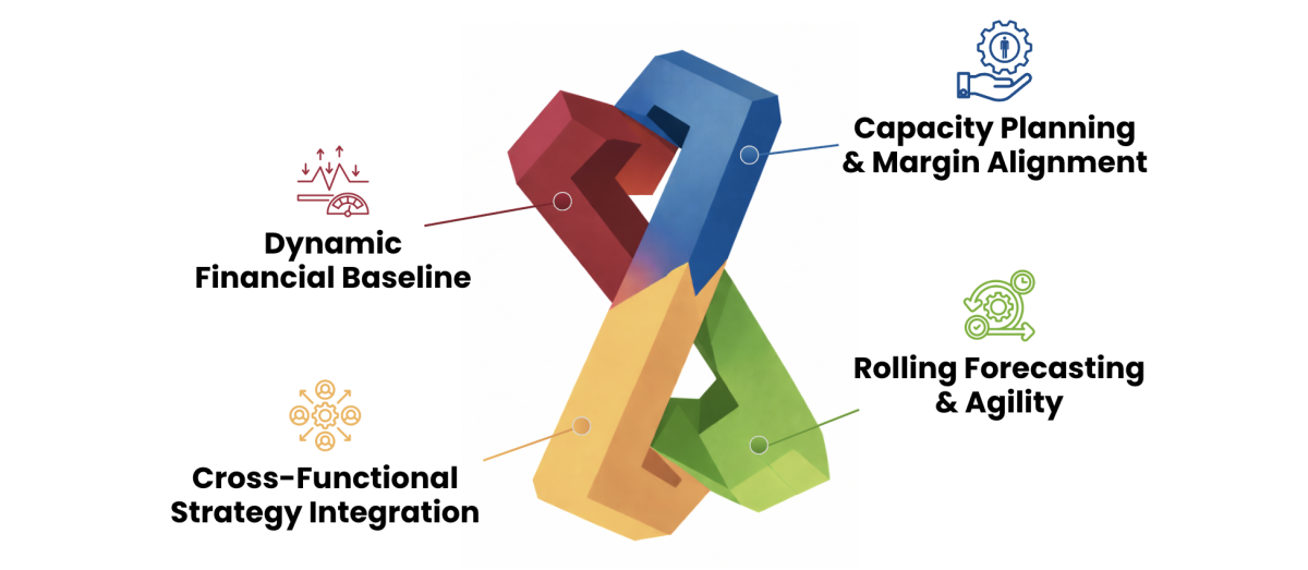 Integrated FP&A connects all layers of planning into one coherent ecosystem. As illustrated in Figure 1, the model rests on four interdependent pillars, each essential for achieving agility, alignment, and strategic impact across the organisation.