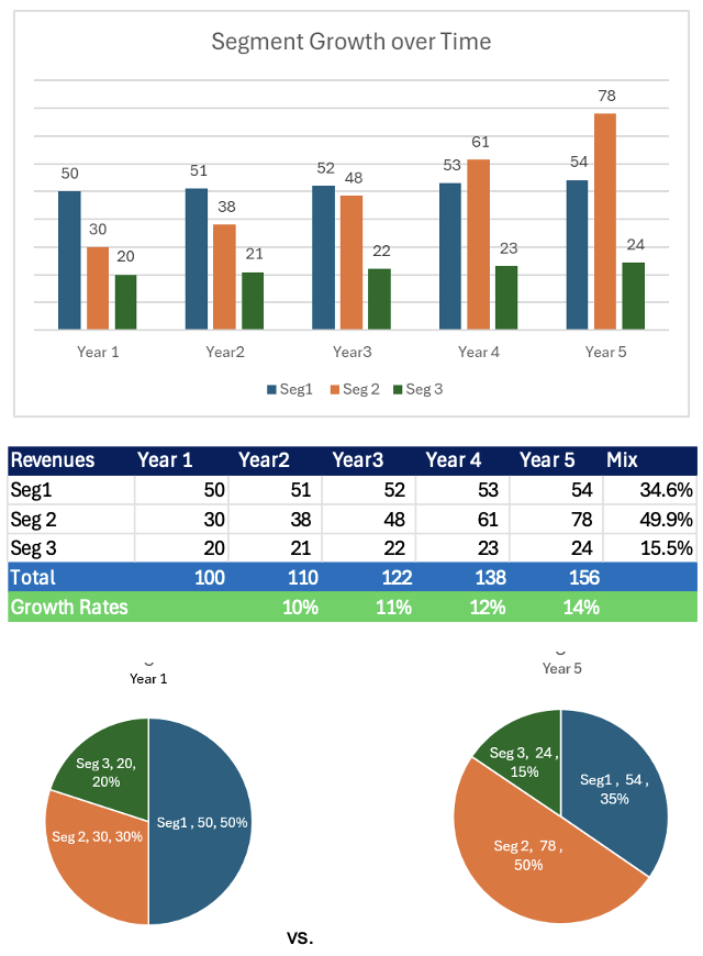 This structure reveals how faster-growing segments can shift the composition of the business, impacting strategy, investment, and talent deployment.