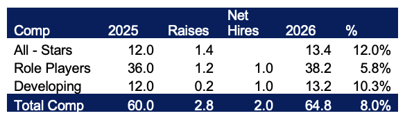 While it’s helpful to measure compensation by revenue segment, another layer of insight is segmenting compensation by talent composition. We use a sports analogy to classify employees into three categories: