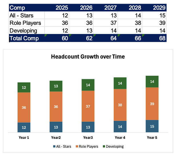 An 8% growth model example shows how compensation shifts across talent tiers. This allows us to assess not just cost but also the strategic quality of our investment in people.