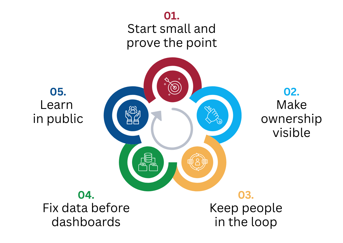 We’ve named owners for each initiative; there are no committees. We count minutes saved. Progress is shared and celebrated.