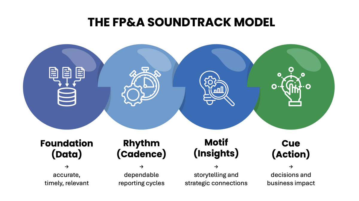 Successful soundtracking is based on layering. Much like the way in which the more basic musical elements and instrumentation form the base layers upon which the more nuanced and sophisticated melodic elements of the movie soundtrack are built, effective FP&A storytelling and delivery of strategic insights very definitely still rely on the cadence, accuracy, and dependability of data and reporting. It takes a solid base upon which to build something great. Think of it as: foundation (data) → rhythm (cadence) → motif (insights) → cue (action).