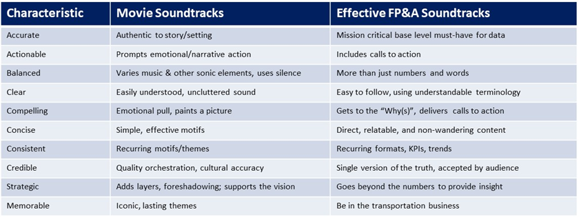 The parallels between movie soundtracks and FP&A soundtracking become even clearer when mapped side by side.
