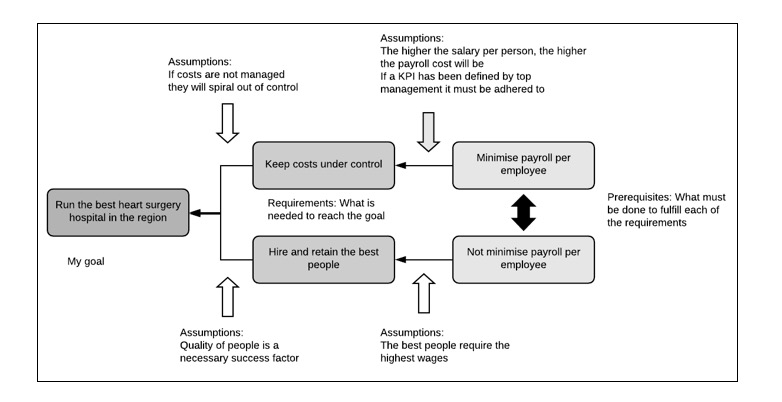 The next step is to analyze the assumptions behind the logical connections. In this case, since we have already seen the negative effects from the KPI we must focus our efforts on trying to find logical flaws in the link between the prerequisite of salary per person and the requirement of keeping costs under control. What are the assumptions here?