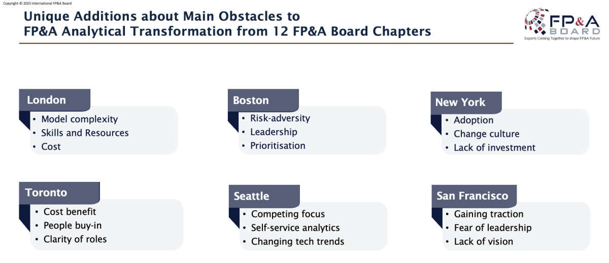The Munich insights aligned closely with themes observed across 12 other FP&A Board chapters. Globally, transformation barriers include model complexity (London), leadership prioritisation (Boston), change culture (Toronto), fragmented ERP environments (Amsterdam), and sponsorship issues (Paris).