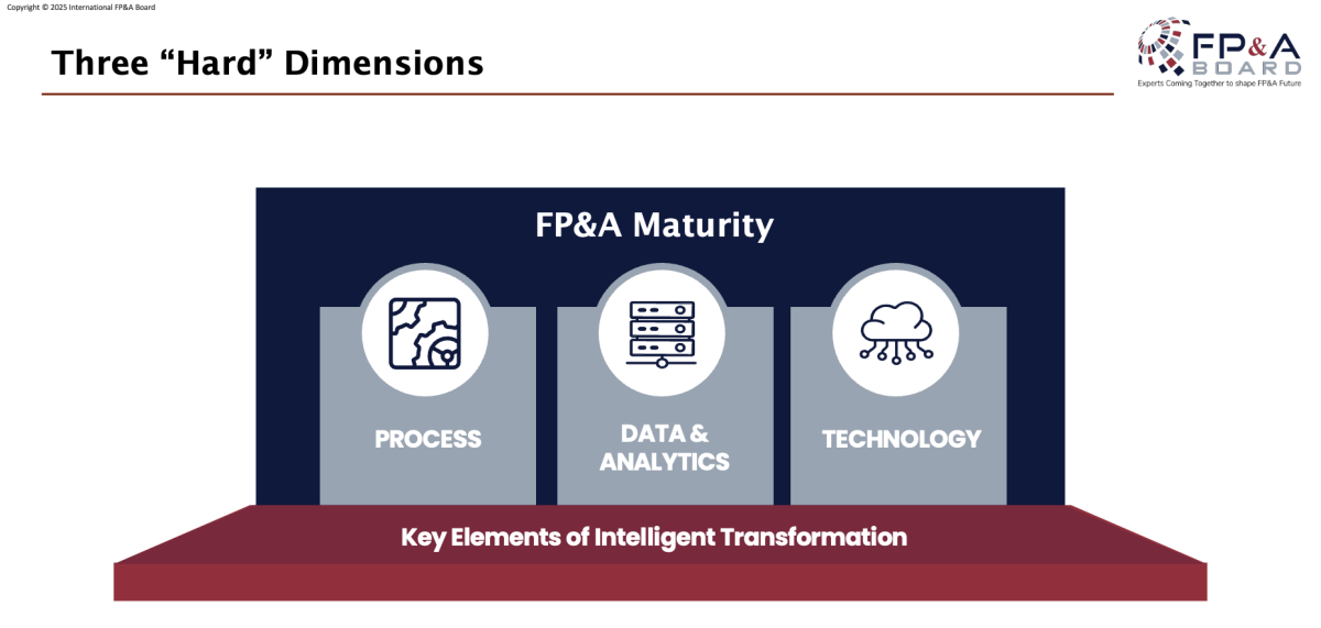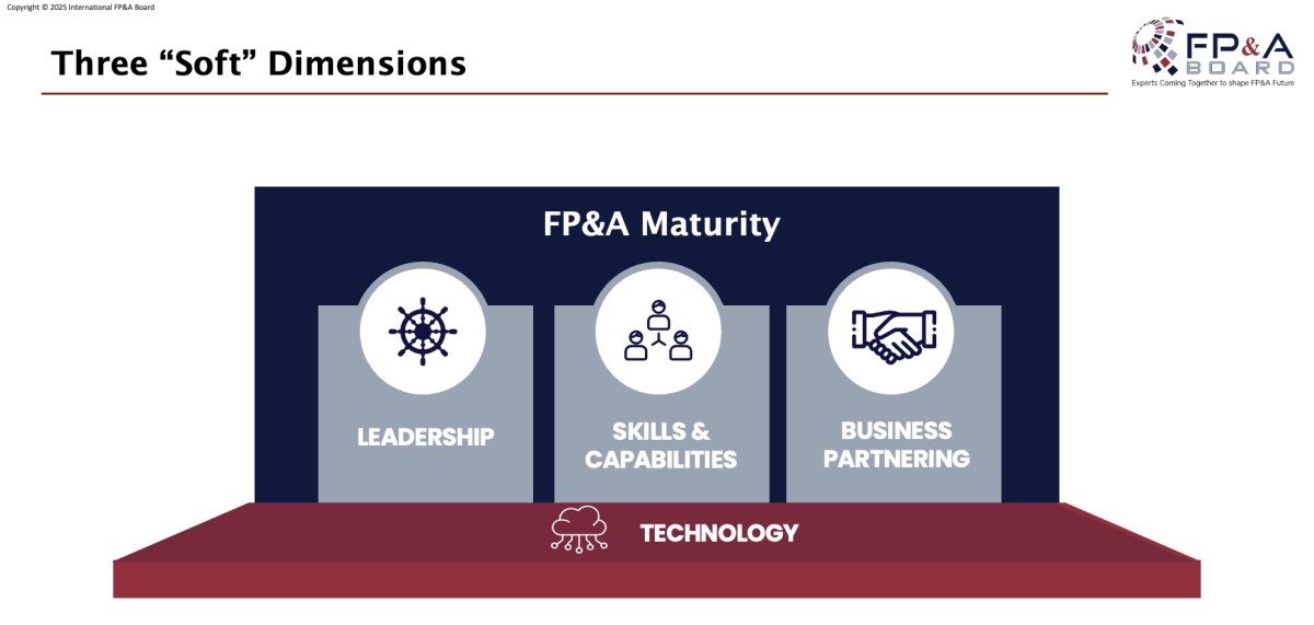 The session reviewed the distinction between the soft and hard dimensions of FP&A maturity. The soft dimensions, Leadership, Skills & Capabilities, and Business Partnering, shape behaviours, influence, and collaboration.