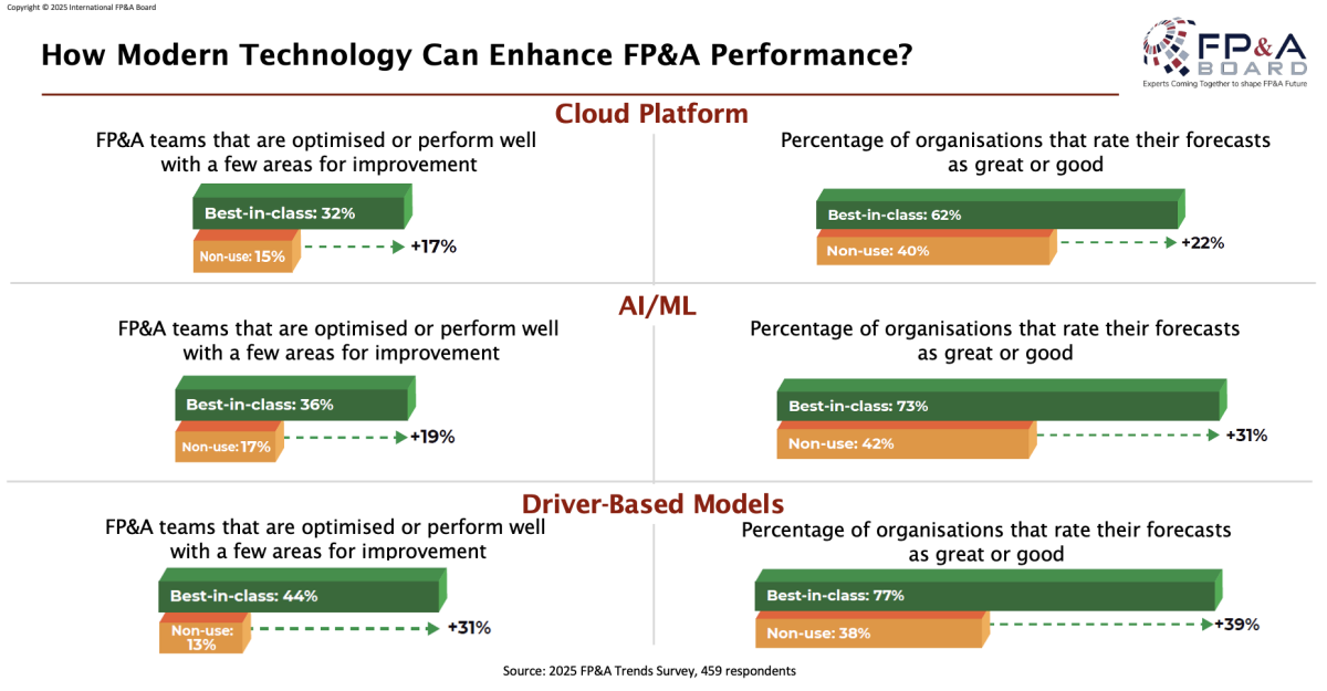 The Munich discussion highlighted that modern technology delivers clear, measurable improvements in FP&A performance. According to the 2025 FP&A Trends Survey (459 respondents):