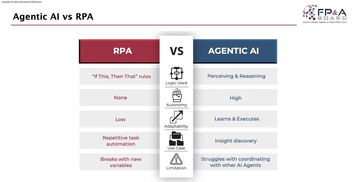 Participants contrasted traditional RPA, which is rigid and rule-based, with Agentic AI, which learns, adapts, and reasons. The shift mirrors FP&A’s own journey: from mechanical reporting to intelligent, anticipatory analysis.