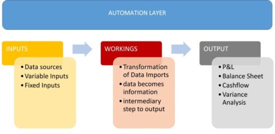 If this model is to be used for month-end reporting, automation may be used to roll over previous accounts, and query data from accounting systems