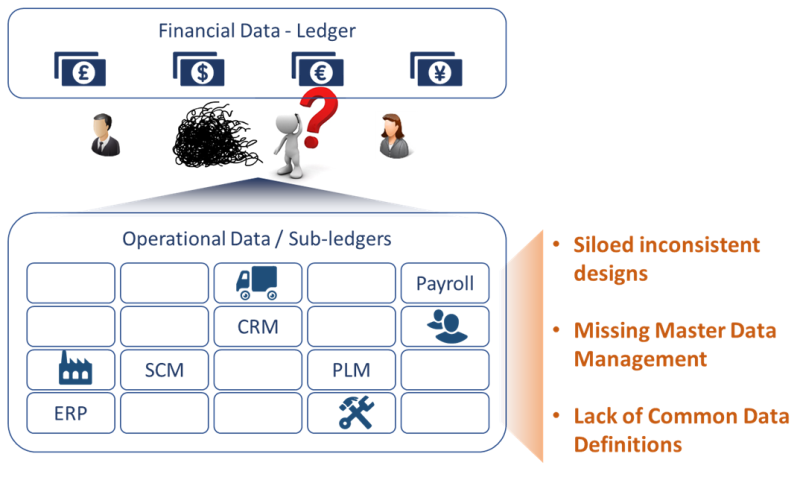 - Missing Master Data Management impedes the ability to connect data across applications. e.g. for the same transaction, if the customer number and name is different in the CRM application versus the ERP application, then the FP&A team cannot link the two data sets together - Orders from CRM and Invoices from ERP - for analysis.
