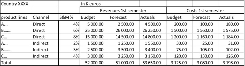 Depending on its product and channel mix and evolution, each country had then a flexible target in terms of sales and marketing expenses (instead of fix amounts of Euros and Headcounts). Although measured each month, the target was by semester. The below table shows the evolution of the target within a semester. At the time of the budget the S&M expenses had to be contained within 3 125k€, the forecast at mid-semester would only give an envelope of 3 080 K€ whereas the final semester revenue achievement gives 3 198 k € target. The actual S&M expenses were then compared to this final amount.