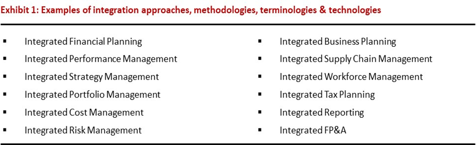 What’s the difference between IFP and IBP? And how do IFP and IBP differ from the plethora of integration approaches and terminologies, examples of which are shown in exhibit 1? These questions were posed to me by a Vice President of Finance of a Global Manufacturing Company, hereafter referred to as Bob and GMC respectively.