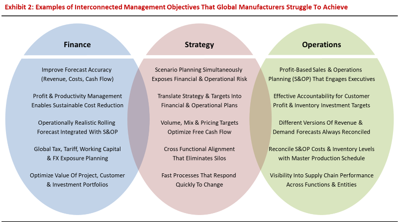 There are two limitations of these technology-based maturity models. First, they aren’t industry-specific, so they don’t reflect unique needs of specific industries, like manufacturing. Second, they don’t recognize that SFO objectives [shown in exhibit 2] become highly interconnected as complexity increases. As a result, capability gaps in traditional financial and operational applications are not always exposed.