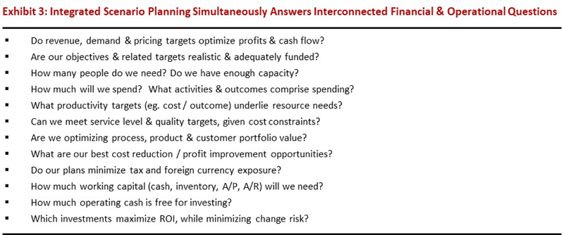 For Bob, the most glaring of these capability gaps was scenario planning. He envisioned an end to end scenario planning process that could answer interconnected questions, like those shown below in exhibit 3. This process would provide the basis to develop and deploy executable plans, while simultaneously optimizing free cash flow and exposing financial and operational risks.