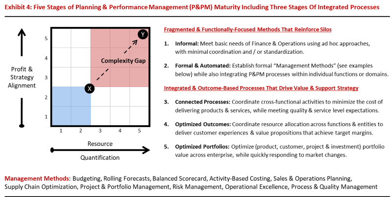 Stages 3 to 5 represent mature forms of integrated [and outcome-based] processes that are represented by the pink box in the top right. The hallmark of these maturity stages is improving the effectiveness of these management methods by embedding them into processes that integrate strategy, finance and operations.