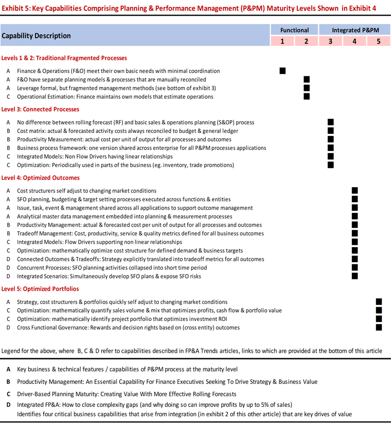 Details of the capabilities [shown above in exhibit 5] are contained in three separate FP&A Trends articles, links to which are provided at the bottom of this article. Each capability in the exhibit has a letter reference, which is described in the legend at the bottom of the exhibit. Three key insights can be gleaned from this exhibit:
